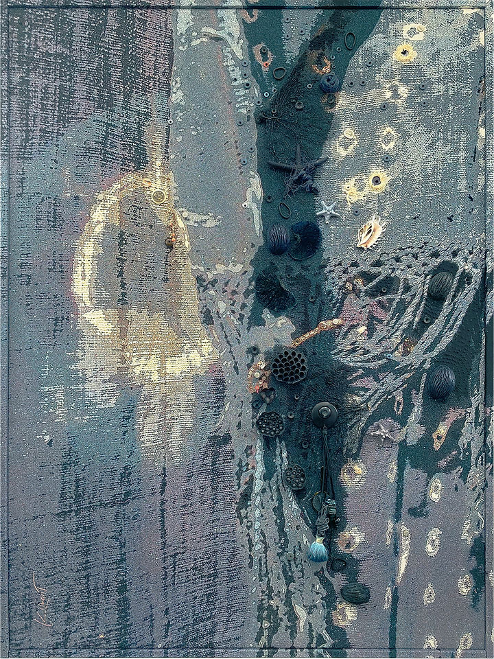 Materials: digitally woven jacquard textile with embroidery accents mounted onto a cradleboard frame, natural specimens including mango pods, sponge mushrooms, lotus seed pods, shells, sea stars and fans, buttons, studs, yarns, twine, and a faux antique magnifying glass.